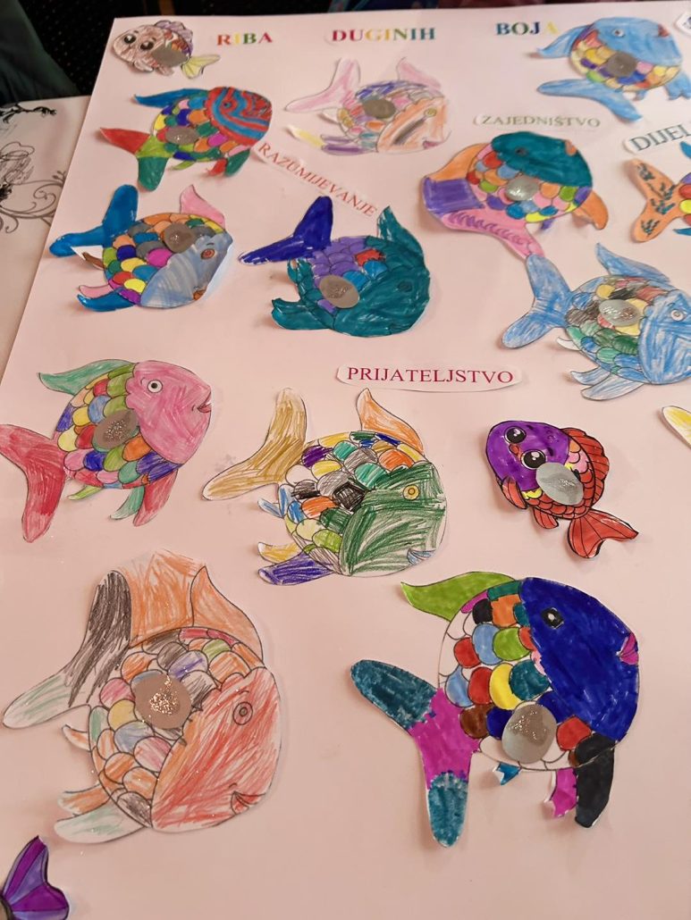Druga slikovnica koju smo im pročitali je Riba duginih boja. To je pripovijest o sudbini ohole Ribice-Srebrice u oceanu kao metafori ljudske zajednice koja nosi poruku o zajedništvu i dijeljenju.