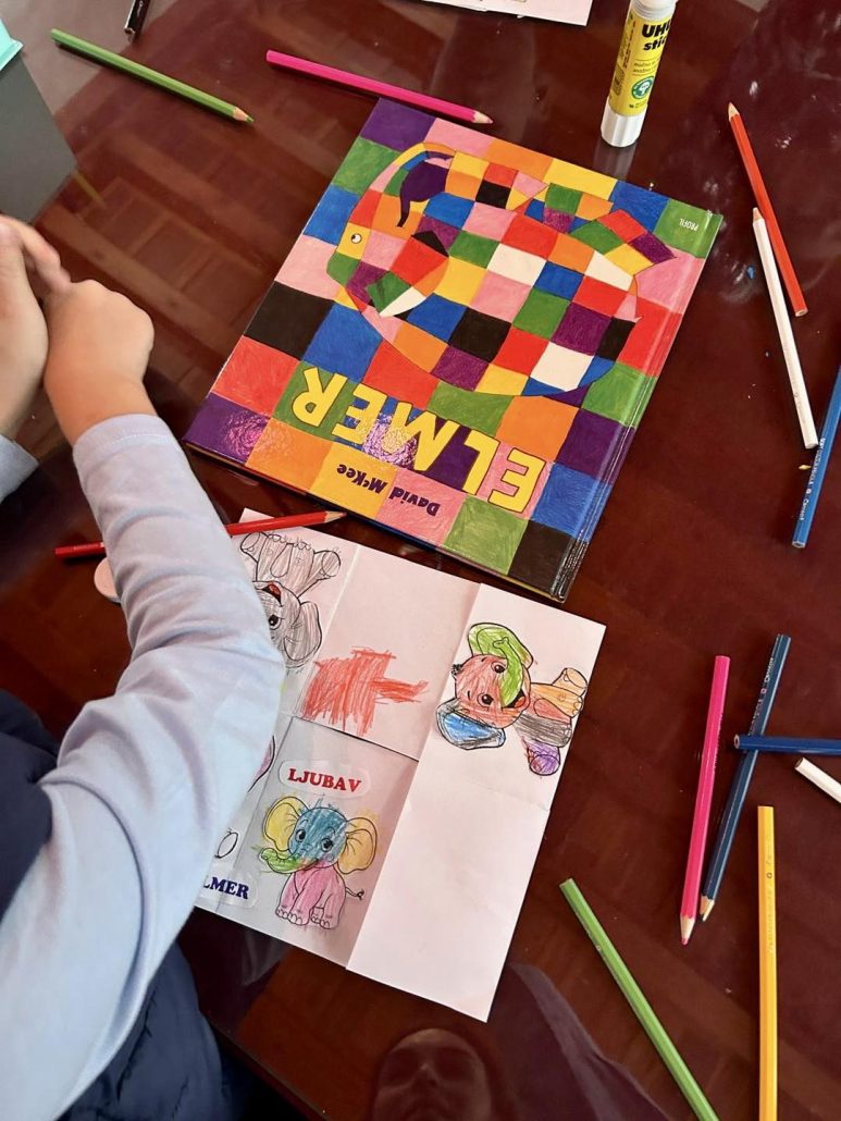 Tematika radionica bila je vezana za slikovnice koje im je pročitala knjižničarka Željana Serdarević (Elmer i Riba duginih boja) gdje su djeca svoju maštu i doživljeno prenijela na papir izradivši svoje slikovnice i plakate. Radove su veselo ponijeli u vrtić kao uspomenu na grupni posjet Knjižnici.
