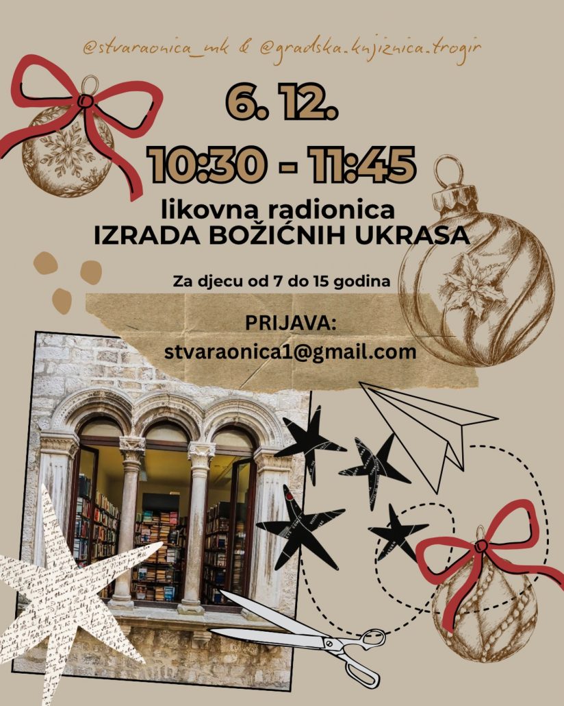 U suradnji sa Stvaraonica.mk Trogir organiziramo besplatnu božićnu radionicu za djecu od 7 do 15 godina gdje će djeca uz stručno vodstvo izrađivati božićne ukrase od raznih materijala i time stvarati i razvijati osjećaj o lijepom, kulturnoj baštini i starim zanatima.
