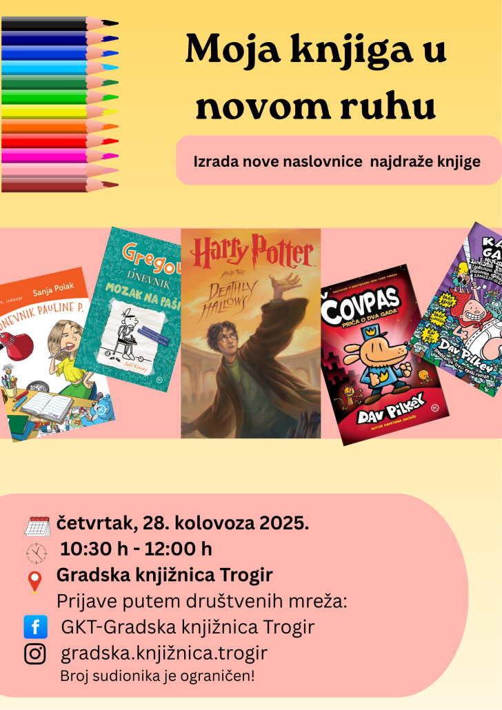 pozivamo vas na kreativnu radionicu u kojoj ćete osmisliti i izraditi novu naslovnicu svoje najdraže knjige! Ponesite omiljeni naslov i pustite mašti na volju! Radionica je namijenjena učenicima osnovnih škola.