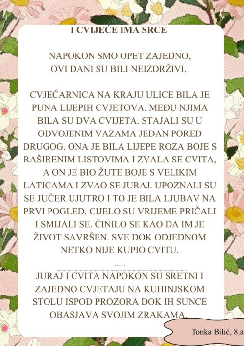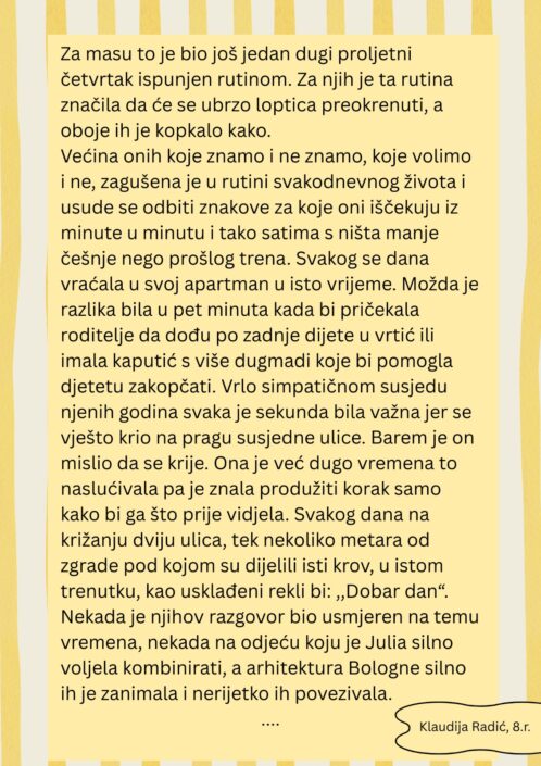 Kreativna atmosfera potaknula je učenike na aktivno sudjelovanje, a njihova maštovitost i originalnost došle su do punog izražaja. Učenici su podijelili svoje literarne uratke s grupom, dok čitatelji u nastavku mogu pročitati odabrane ulomke.