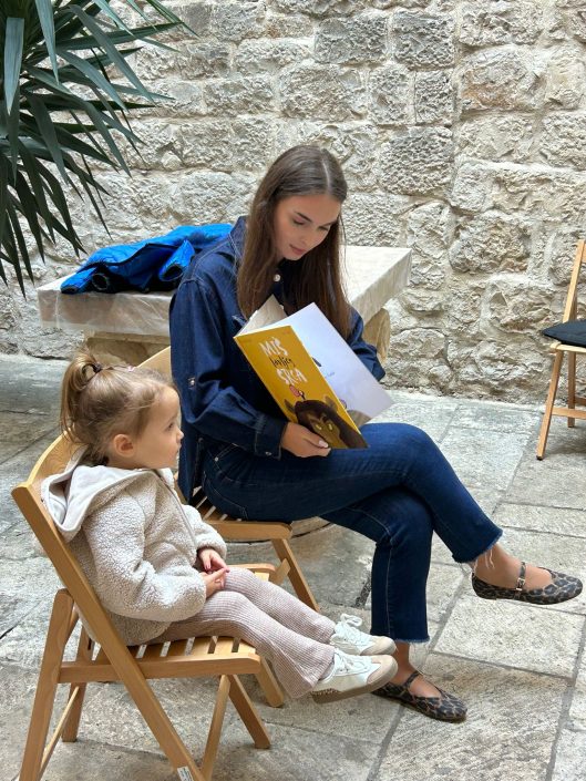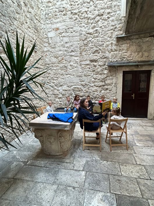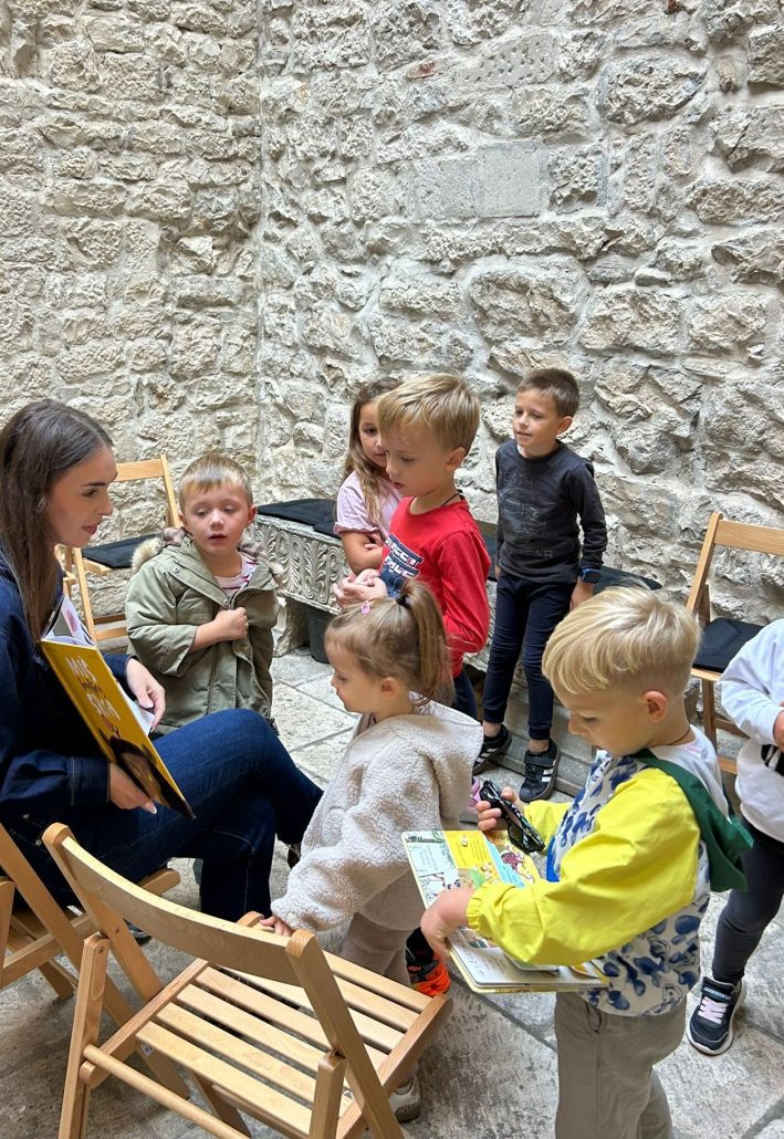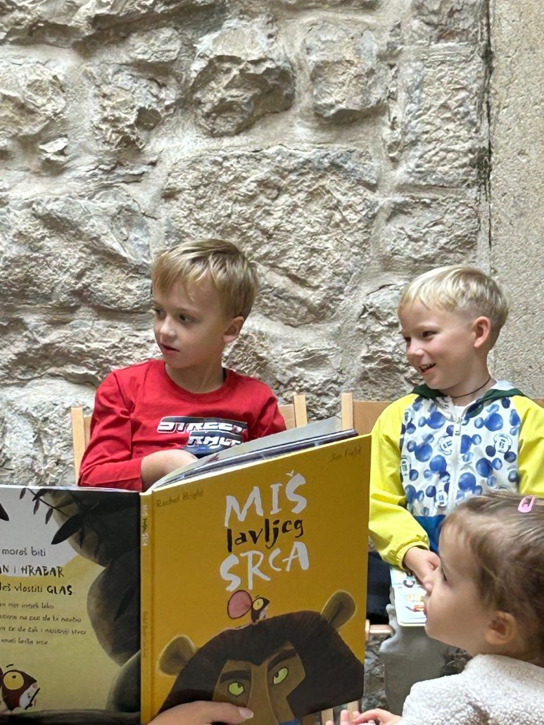 U dvorištu knjižnice nastavili smo druženje čitanjem slikovnice Miš lavljeg srca, koja je osvojila srca mališana ne samo toplom porukom o hrabrosti, već i prekrasnim ilustracijama.